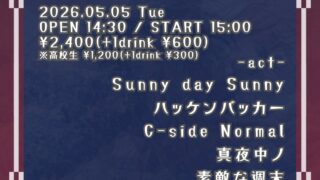 LIVE 2026年5月5日(火・祝)_ANTERA 3rd Anniversary Week DAY7@Community Space ANTERA 14:30 / 15:00 adv / door ¥2400 (1ドリンク別¥600) Sunny day Sunny / ハッケンバッカー / C-side Normal / 真夜中ノ / 素敵な週末 / 断絶交流 LIVE