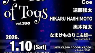 LIVE 2026年1月10日(日)_Jumble of Toys vol.186@LIVE HOUSE KOKOPELLI 16:30 / 17:00 adv / door ¥1500 / ¥2000 (1ドリンク別¥500) クテノサウラ/Coe/遠藤稜太/HIKARU HASHIMOTO/黒木裕太/なまけものりこ&雄一(from ハッケンバッカー) LIVE